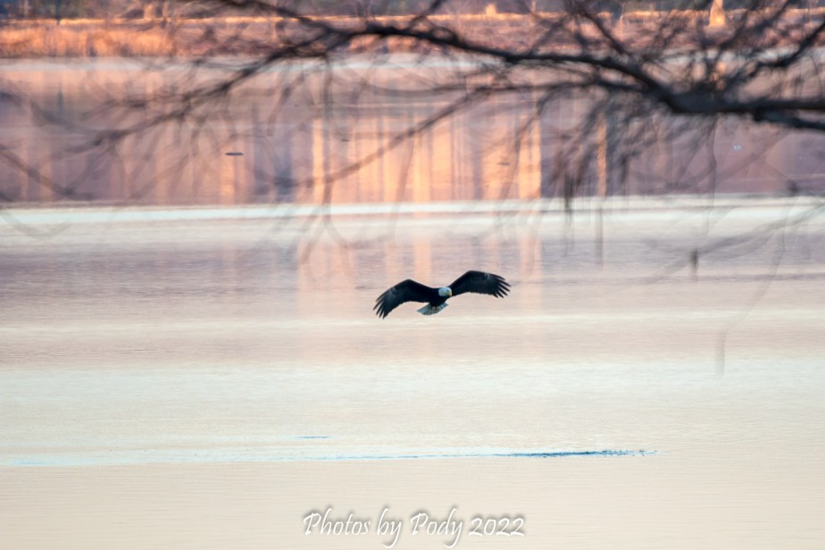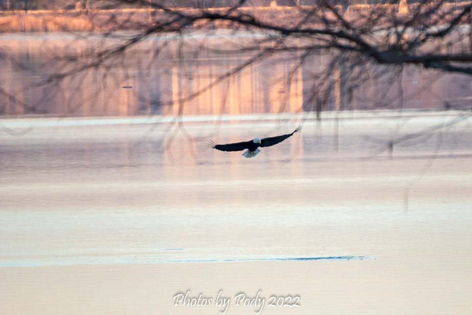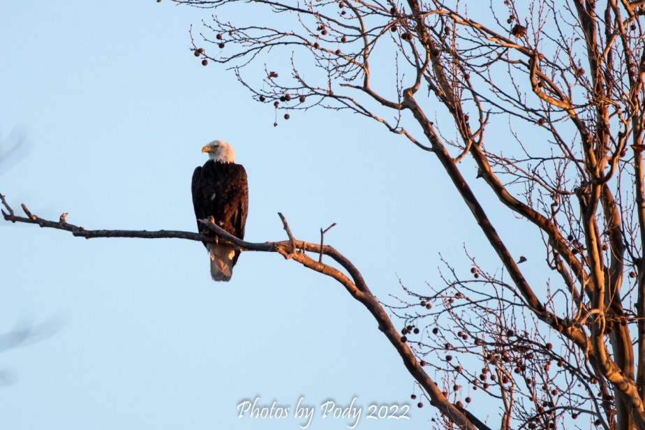I turned around to look for the Eagles. Directly behind me, still before sunrise, one was perched in the trees. Of course I took about 40 pictures from that angle. There were marathon runners already our running around the lake as well. The bird didn’t seem to mind, so I got a little closer. I decided to go back up the hill where I parked to get more of a front view and wait for the sun to highlight the eyes and the side of its face. About 50 more pictures as the sun rose.