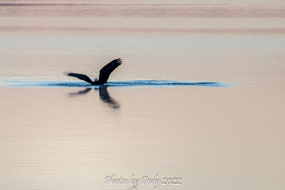 The Eagle hit the water several times and went back up. I jumped off the table and ran downhill, leaving some of my equipment behind near the table. One more swoop to the water and the Eagle captured the American Coot for breakfast!